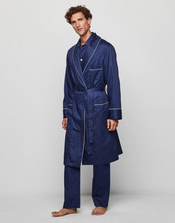 Bata lisa de algodón satinado, cruzada, con tres bolsillos y cierre con cinturón. Completa tu look homewear con el pijama a juego del mismo tejido.