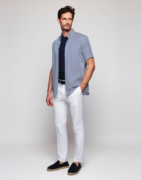 Camisa casual estampado geométrico 100% algodón, cuello americano, sin bolsillo, manga corta, classic fit. La unión perfecta de comodidad y estilo.