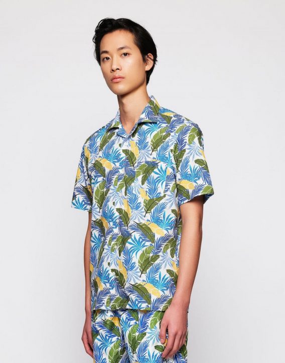 Camisa Hawaiana estampado hojas 100% algodón, cuello camp, bolsillo en pecho, manga corta, classic fit. Bañador hidrófugo a conjunto para crear un total look lleno de luz, perfecto para el verano.