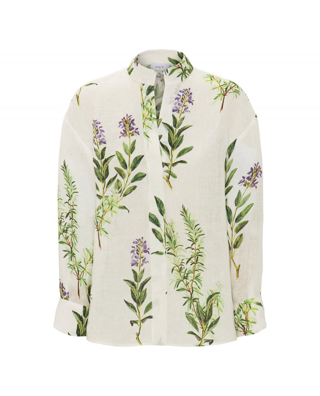 Camisa blanca con estampado botánico verde y detalles morados. 100% Lino. Cuello tirilla con escote en pico, cierre oculto con botones, manga larga con puño y botones artesanales con aplicaciones de flores. Aberturas laterales en bajo. Fit recto.