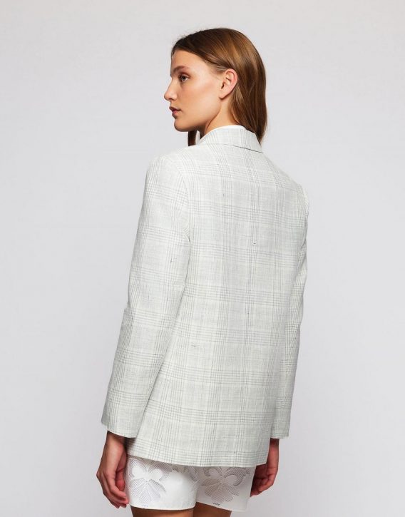 Blazer gris de cuadros en mezcla de algodón y lino. Cómoda y con elegancia natural. Cuello, solapa, cierre central con un botón. Dos bolsillos frontales con tapeta y un bolsillo de ribete en el pecho. Interior forrado. Fit semi-entallado.