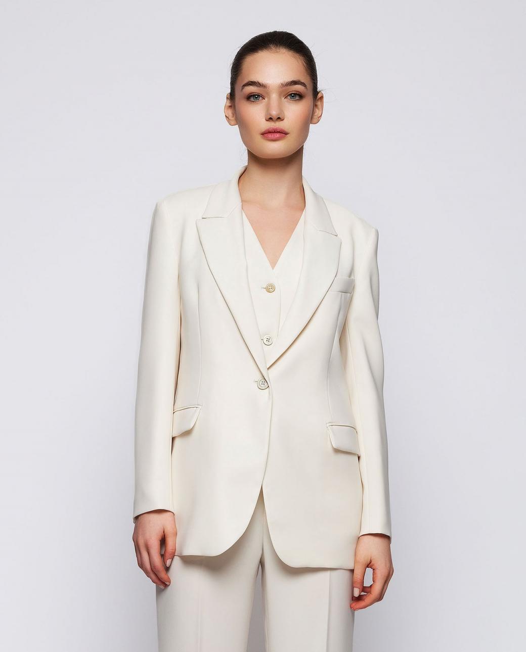 Blazer oversize blanco hueso. Elegancia y versatilidad atemporal. Cuello, solapa, cierre central con botón. Dos bolsillos frontales con tapeta y un bolsillo de parche en el pecho. Interior forrado. Pantalón y chaleco a conjunto para traje completo.