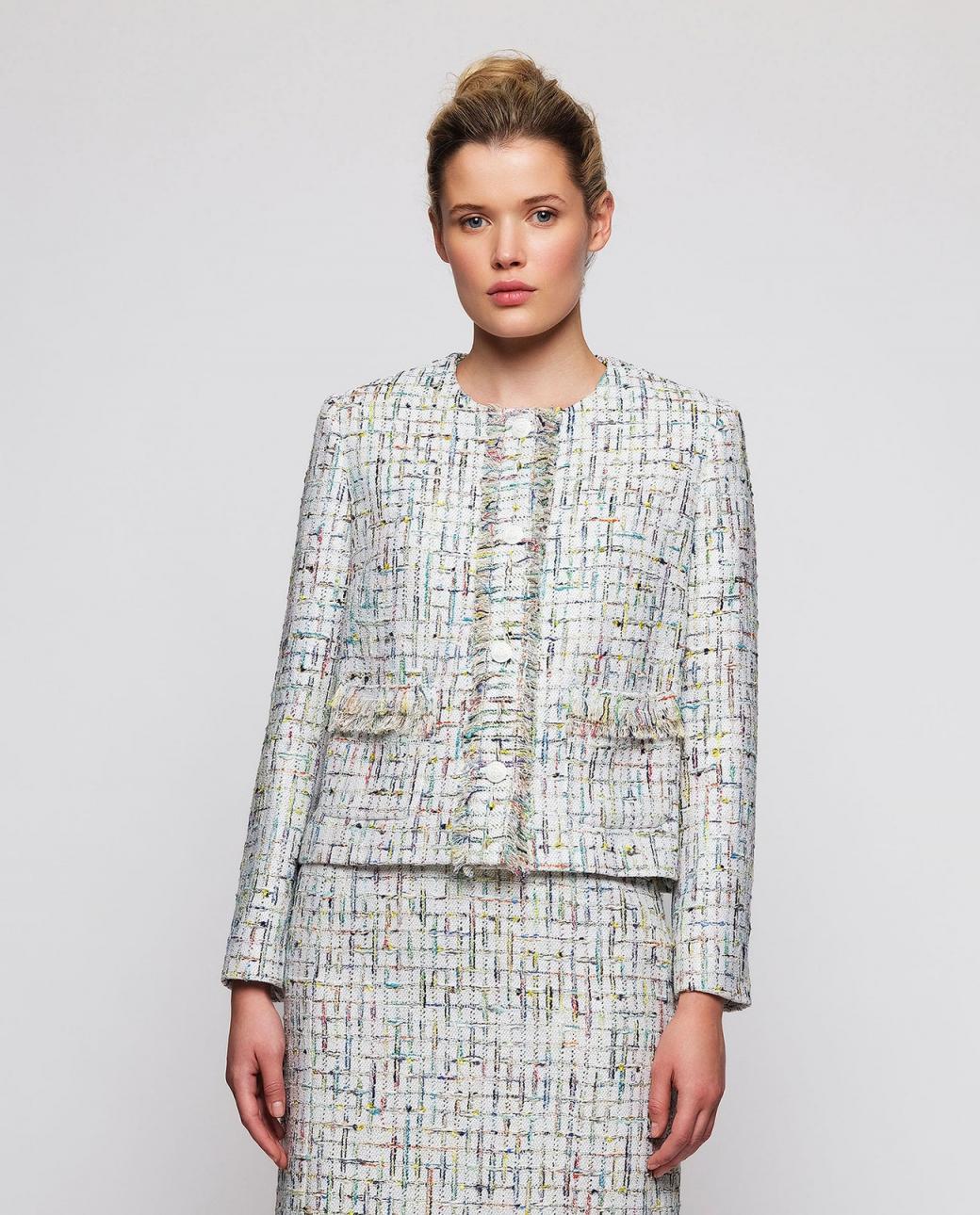 Chaqueta corta blanca de tweed multicolor 100% algodón. Cuello redondo. Cierre central con botones metalizados blancos. Dos bolsillos frontales de parche. Interior forrado. Detalles de desflecados en cierre y bolsillos.