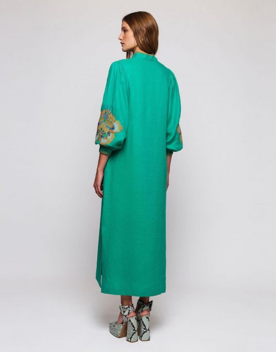 Kaftán largo verde con bordados posicionados en cuello, escote y mangas. 100% Lino. Escote en pico, mangas largas abullonadas. Bolsillos laterales en costura. Aberturas laterales en bajo. Fit holgado.