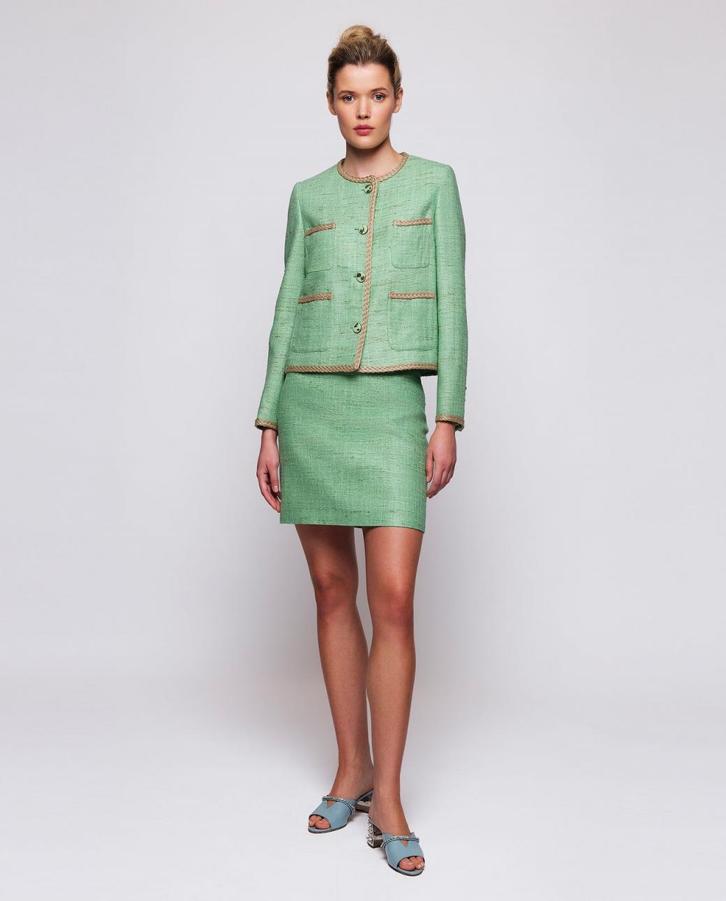 Mini falda verde de tweed 100% seda . Tiro alto con cinturilla. Cierre con cremallera invisible en lateral. Fit recto y largo mini. Chaqueta a conjunto para total look.