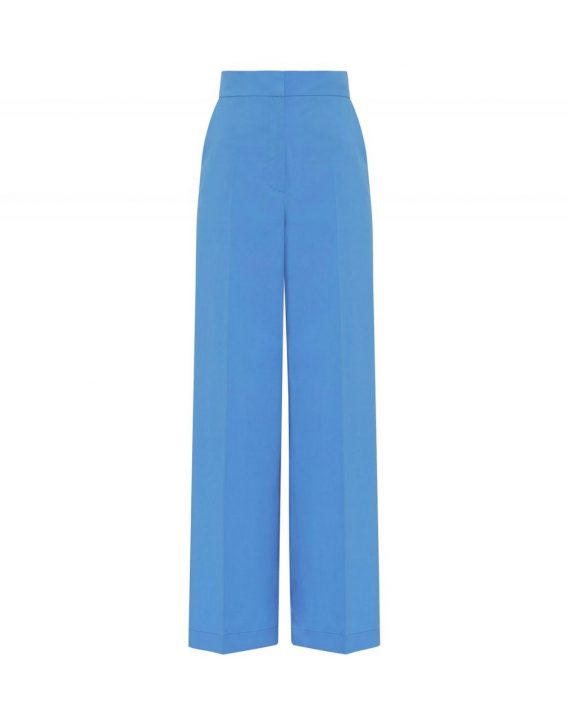 Pantalón azul  de popelín de algodón elástico. Modelo muy versátil. Tiro alto con cinturilla. Cierre oculto con cremallera, gancho y botón. Dos bolsillos laterales y y dos de ribete en parte trasera. Fit ancho. Pliegue planchado en centro. Disponible en color blanco.