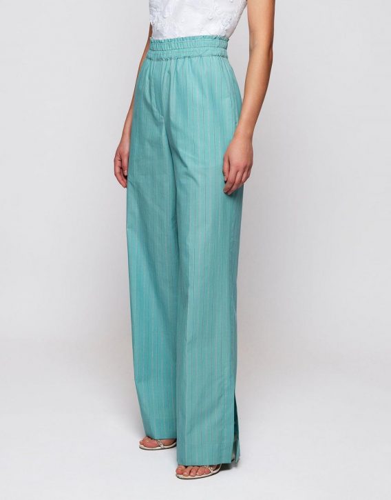 Pantalón verde agua de rayas. 100% Algodón. Un modelo cómodo y original. Tiro alto con cinturilla elástica. Dos bolsillos laterales y uno de parche en parte trasera. Abertura en bajo. Fit ligeramente ancho. Chaqueta a conjunto.