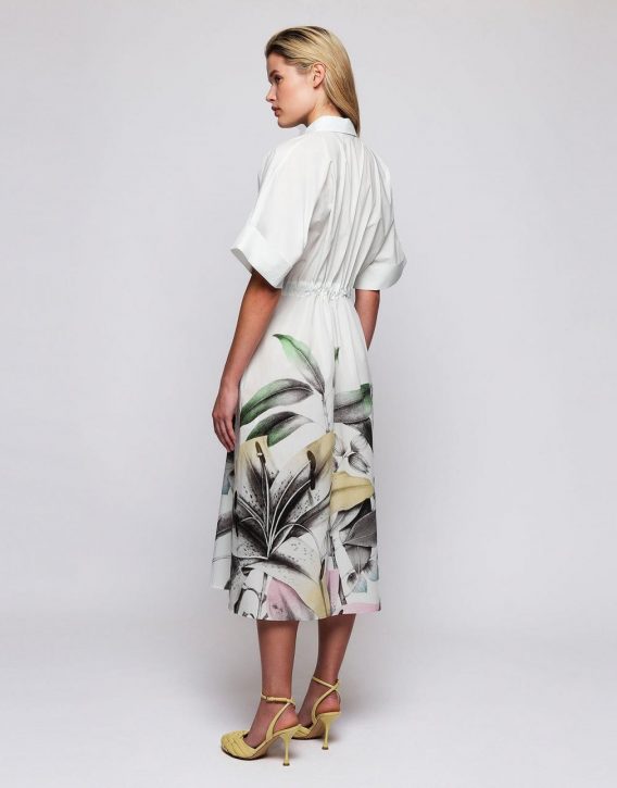 Vestido camisero midi blanco con estampado floral posicionado. Print exclusivo diseñado por MIRTO en colaboración con la acuarelista botánica Sena Cifuentes. Cuello camisero, cierre con botones ocultos, manga corta. Cintura ajustable con cinta. Bolsillos laterales en costura.