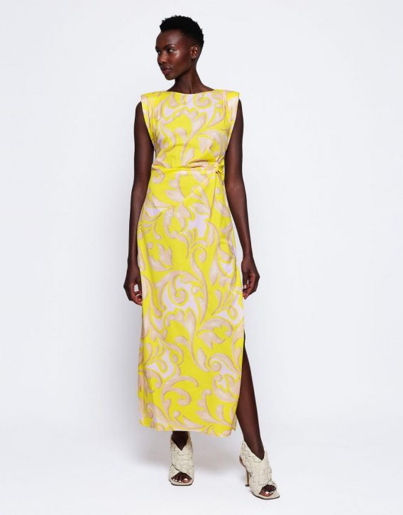 Vestido largo amarillo con estampado ornamental. Algodón elástico. Escote redondo, cierre invisible en espalda, sin mangas. Hombros con pliegues y hombreras. Drapeado en cintura. Abertura lateral. Fit semi-entallado. Disponible en color azul.