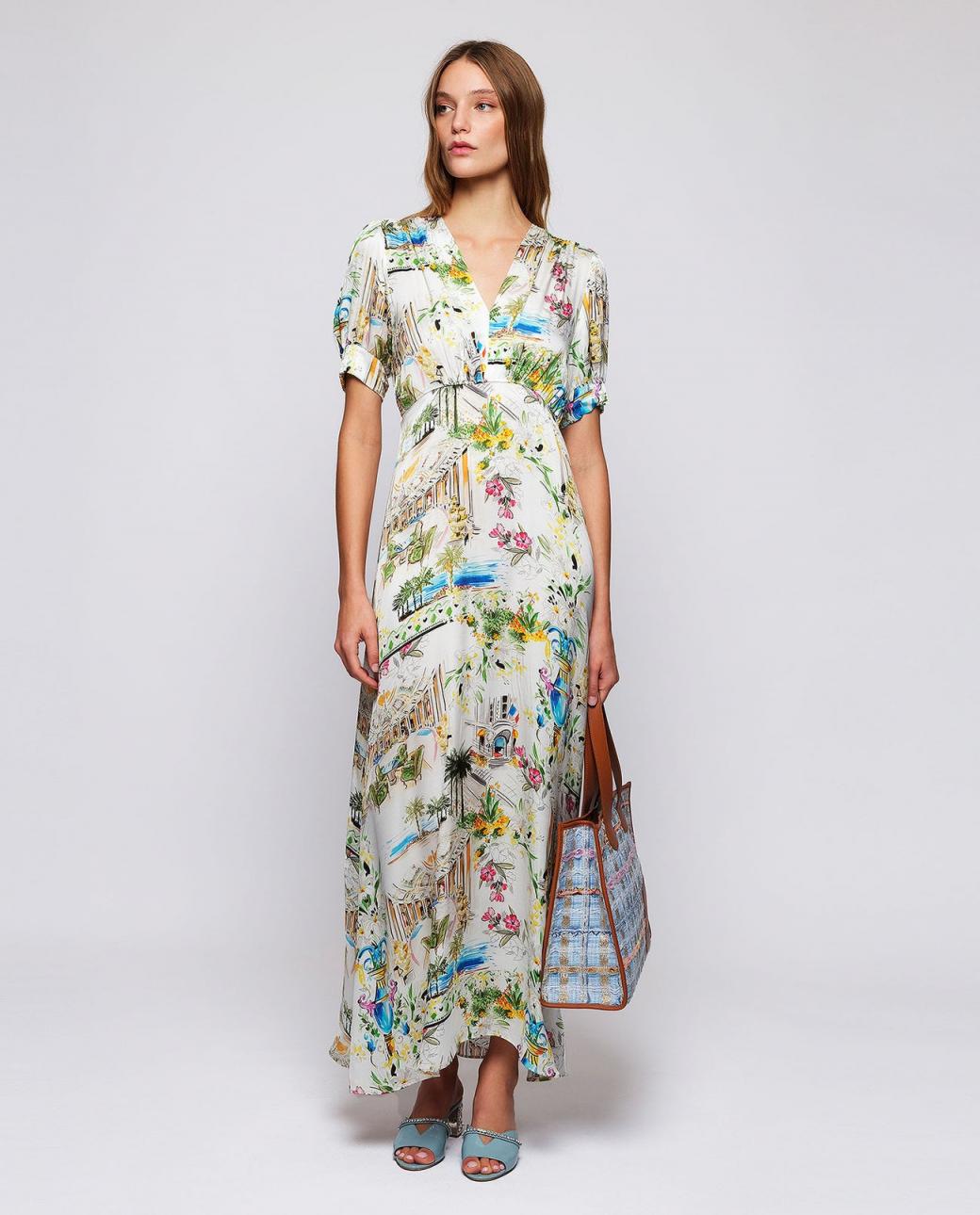 Vestido largo blanco con estampado figurativo. Print que recrea el icónico Hotel Negresco de Niza. Escote en pico, cierre con cremallera invisible en espalda, manga corta ligeramente abullonada con puño elástico. Fit semi-entallado con vuelo.