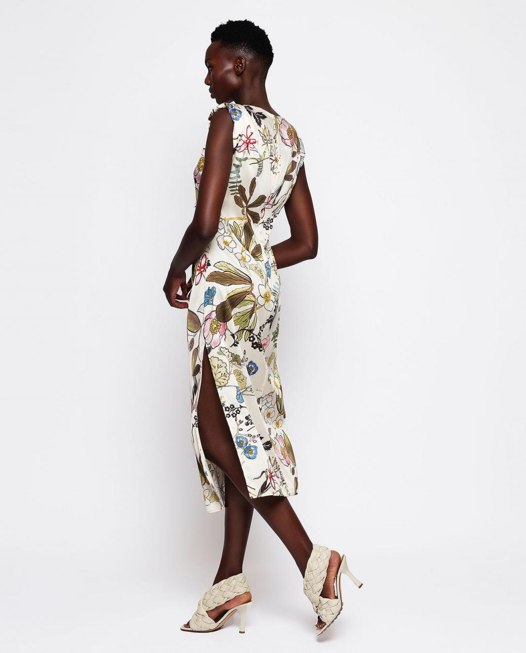 Vestido midi beige con estampado floral botánico. Escote redondo, cierre con cremallera invisible en espalda. Hombros con pliegues y hombreras. Drapeado en cintura. Abertura lateral. Fit semi-entallado.