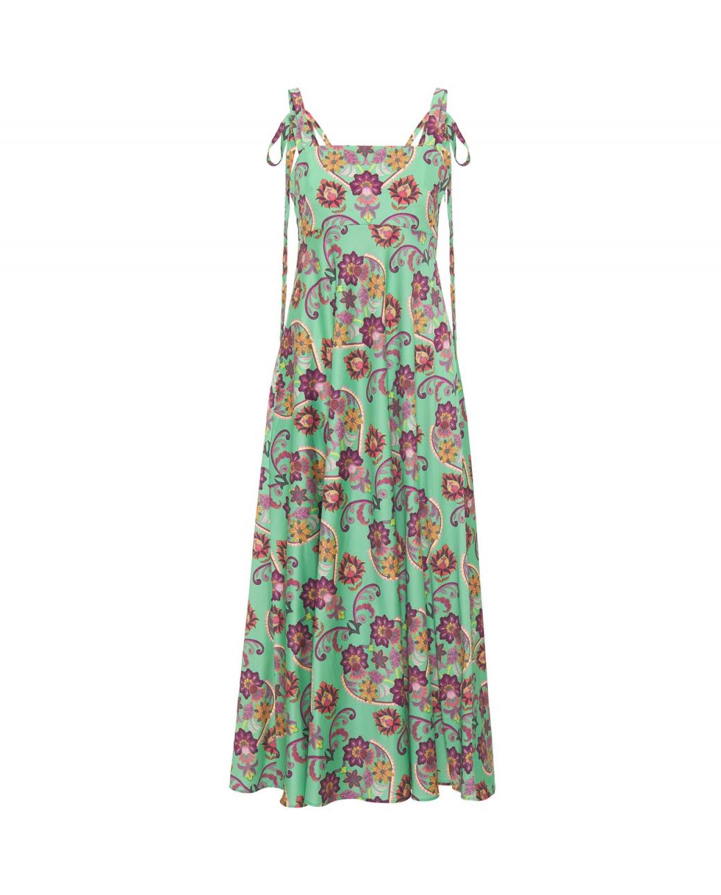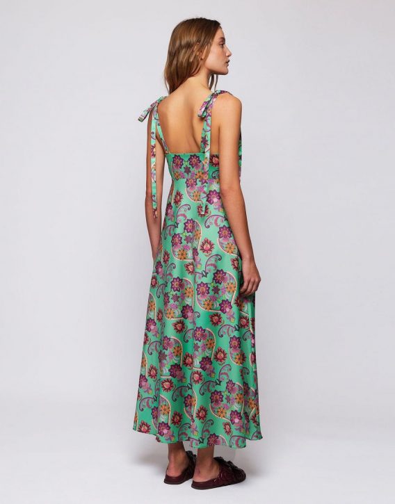 Vestido midi de algodón elástico verde con estampado floral. Silueta versátil y elegante, perfecto para los eventos más especiales. Escote recto, tirantes con lazada. Bolsillos laterales en costura. Fit entallado con vuelo.