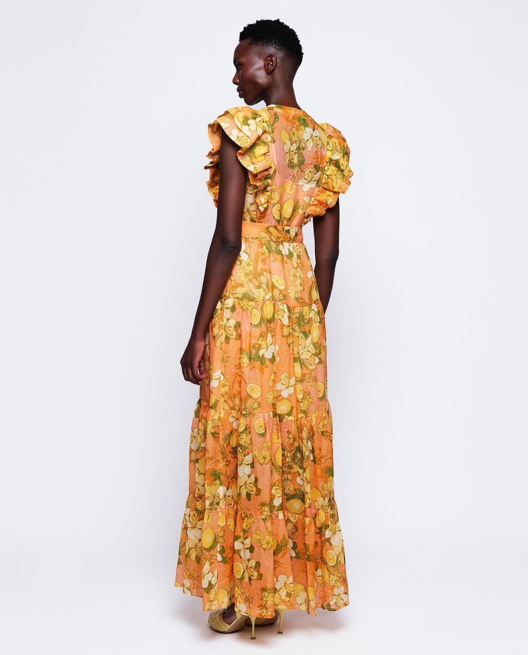 Vestido naranja largo con estampado floral y de limones. Escote en pico, cierre con botones frontales, sin mangas. Detalles de volantes. Cinturón del propio tejido. Acompañado de vestido interior lencero de algodón.