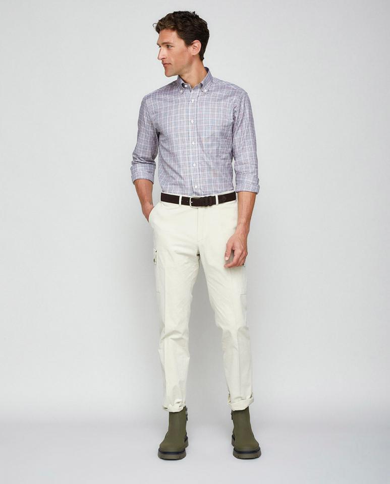 Pantalón casual con bolsillos cargo, en tejido de algodón extensible, sin pliegues y con bolsillo francés. El cierre es asimétrico con cremallera y botón.