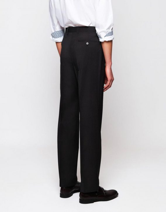 Pantalón recto de vestir, de lana fría, con pliegues y relojera. Los bolsillos delanteros son inclinados, y uno trasero horizontal con ojal y botón. Cierre asimétrico con cremallera y botón. Es un básico para looks urbanos y para compromisos sociales.