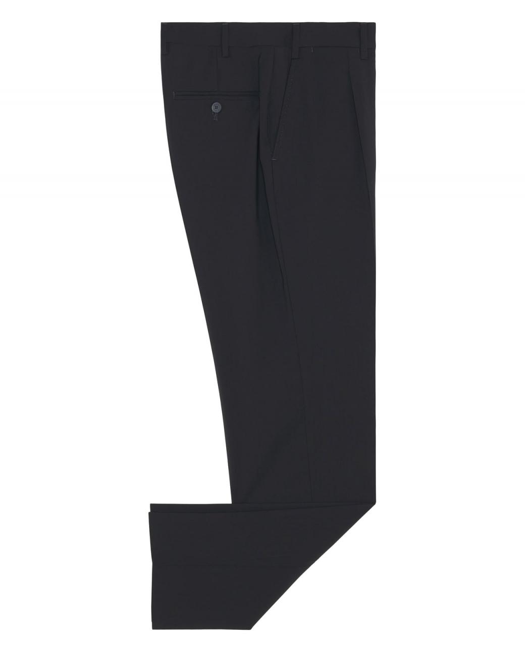 Pantalón recto de vestir, de lana fría, con pliegues y relojera. Los bolsillos delanteros son inclinados, y uno trasero horizontal con ojal y botón. Cierre asimétrico con cremallera y botón. Es un básico para looks urbanos y para compromisos sociales.