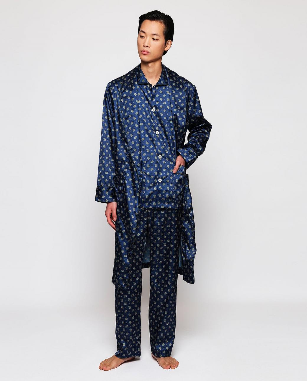 Pijama largo azul marino y verde estampado paisley.100% poliéster satinado con tacto sedoso.Chaqueta abierta con botones, manga larga, tres bolsillos, cuello camisero y vivos al tono. Pantalón largo a juego de corte recto, dos bolsillos, cintura elástica y cierre con botones. Combina con bata cruzada a juego.