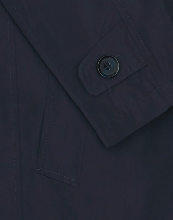 Chubasquero largo azul marino capucha oculta. Realizado en tejido técnico resistente al agua. Bolsillo en pecho y bolsillo lateral. Cierre con cremallera bidireccional y ajustador en cadera.